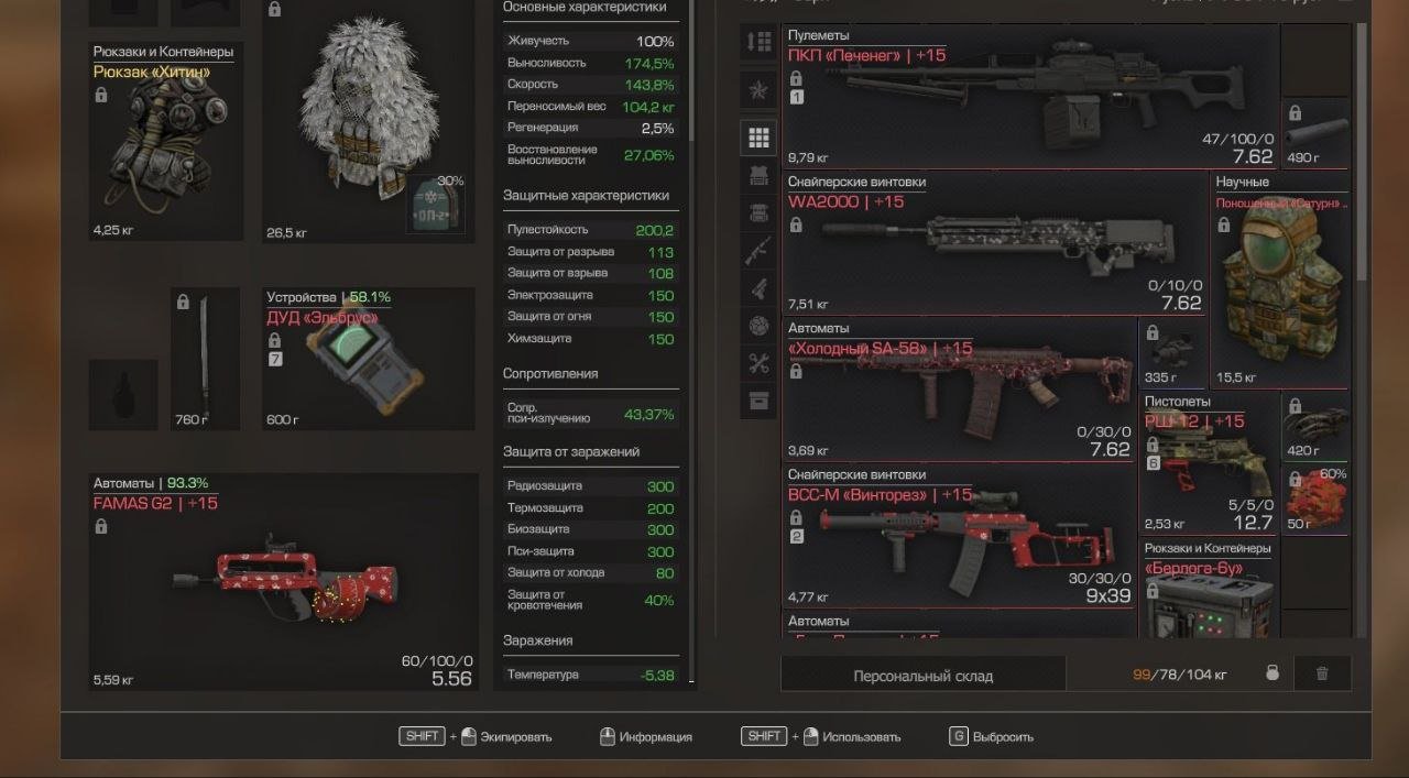 Штурма +15, Гаусс +15, ХИТИН, ПКП +15, Скар-ш +15, SBA TANK+15, WA-2000 +15, А-545 +15, РШ-12 +15, ВСС +15, ФНТ +15 (JFG), ФАМАС Г2 +15, ППК-20 +15, Крисс вектор +15, АШ-12 +15, Пон. Сатурн +15, АМБ +15 (Гнев Перуна), Гончий +10, ОЦ-14М Разряд +10, SCAR SSR +10, Огнемет, Хладорез, РПЛ-20, McMillan CS5, QBZ-191, НГ Glock 18X +12, ДУД ЭЛЬБРУС, Берлога-6у, Контейнер Улей, Контейнер КСМ, 80к Обменных монет, 1кк Деталей для Ремонта, Все ОБВЕСЫ с Оружейных ящиков/ящиков с КВ, все Оружейные гильзовые чертежи кроме лег, Обвесы с топ ЧЕРНОГО РЕЙДА (Топ глушитель, Топ ЛЦУ и Топ РУКОЯТКА РК-2) 7кк валюты на акке, Жетон Эстета.