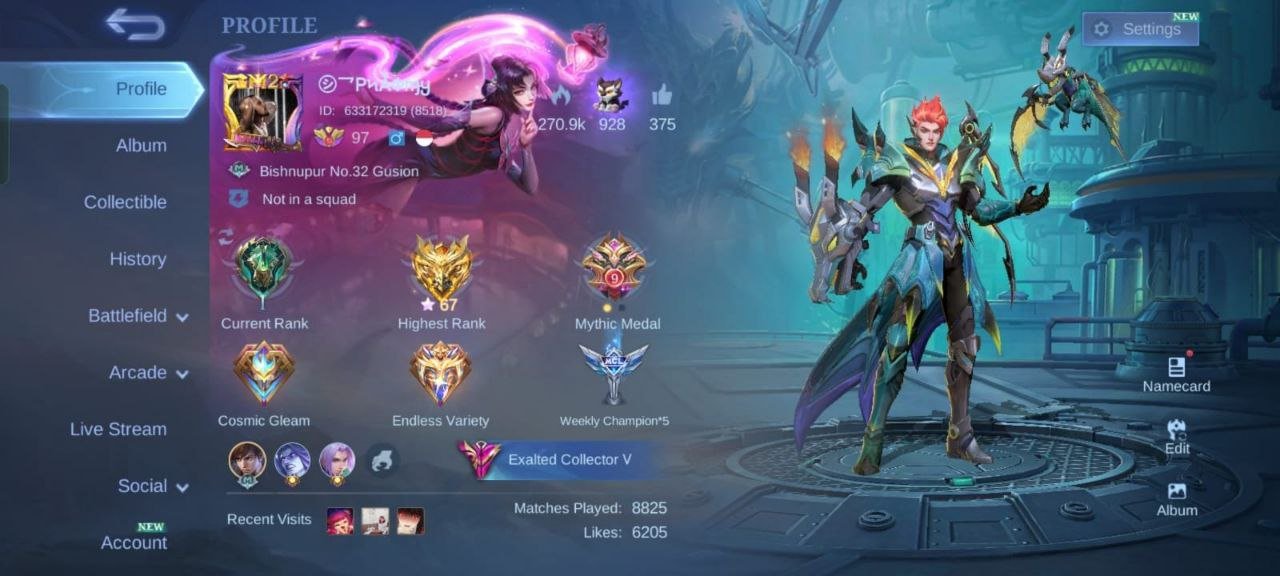 Lv104/ExaltedCollector/33Skin/3Legend/Zenith-Vexana/11.11-Gusion/Xavier-GojoSatoru/Aspirant-Change/Exorcist-Kagura/ChouKOF