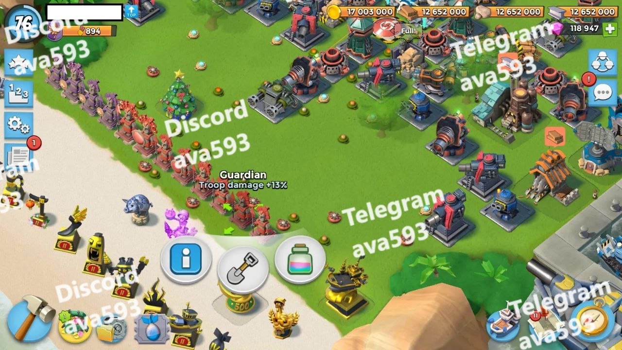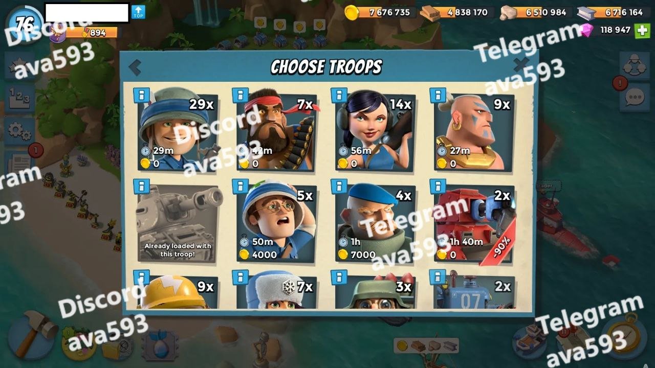 More Details: Troop damage +32,13,13,13,13,12 – Troop health +34,14 – GunBoat +42,17,17,17,17 + 118K