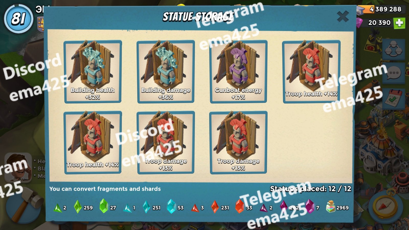 Statue storage: Building health 32%, Building damage 36%, gunboat 17%, troop health 14%, 14%, troop damage 13%, 13%. Engravings MAX Lvl, tokens: 437 Sabotage 33%, Armor 70%, Adrenaline 17%, Leech 13.5%, Ordnance 26%, Interference 12.5%, Triage 32%, Power surge 40%, Insulation 41%, Rally 0.51%, Alchemy 88%, Intel 27%.