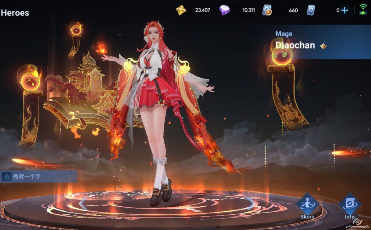 Skins: WORLDLY: Yang Jian (Siegebreaker) S2: Biron (Fate Arena) S7: Guiguzi (Misty Orison) CHAMPION: Zhou You (Eclipse Blaze) EPIC: Artur (Psychic Fighter) EPIC: Lady Sun (Fruit Sweetheart) EPIC: Da Qiao (Pet Diaries) EPIC: Diaochan (Fiery Spirit) EPIC: Liang (Maven Coach) EPIC: Zilong (Future Era) RARE: Li Bai (Power of Precision) RARE: Fang (Alsahraa Wayfarer) RARE: Angela (Playful Trickster) RARE: Hou Yi (Strike Team Alpha) RARE: Ziya (Envoy of Flame) And another skins