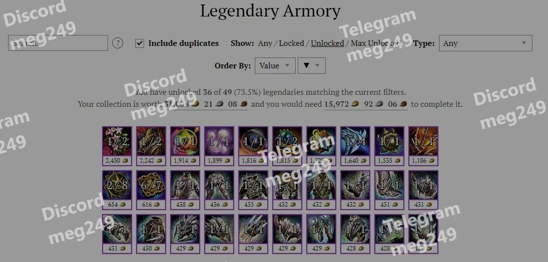 -14K+ liquid gold, (of which 3K+ in wallet) 14 million karma, 11K spirit shards, 2K transmutation charges, dungeon tokens. Armory + Account upgrades: