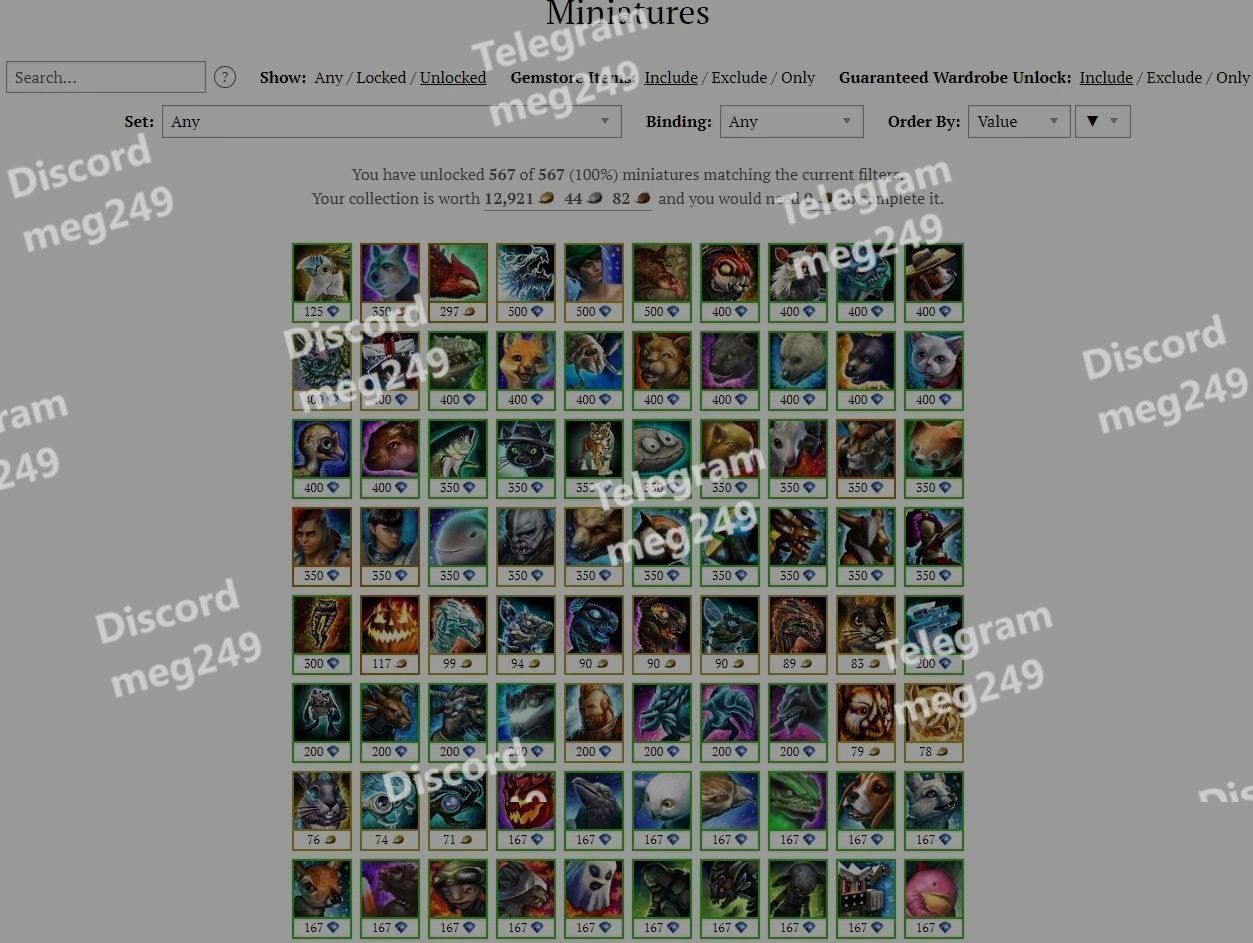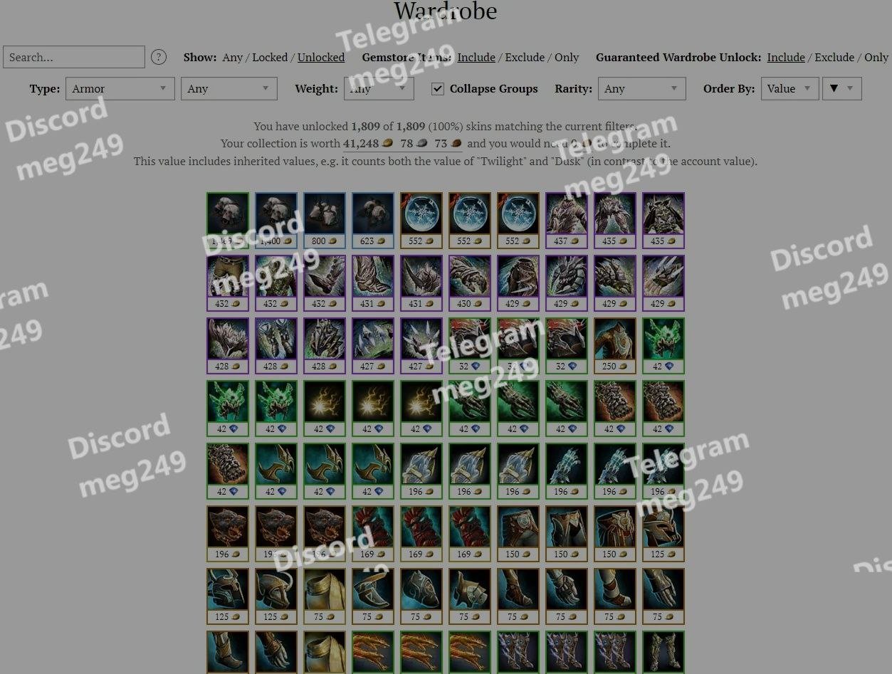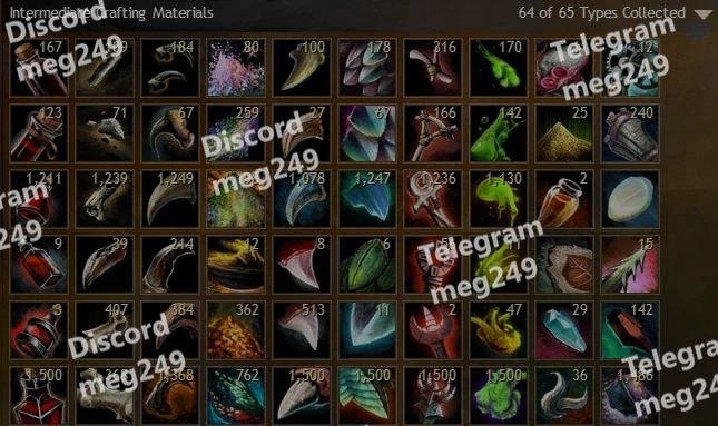 1500 material storage capacity -100K+ gold worth in wardrobe skins and minis (was a personal project of mine to having every skin worth up to 40g to make the wardrobe unlock vouchers worthwhile) -All dyes (including permafrost)