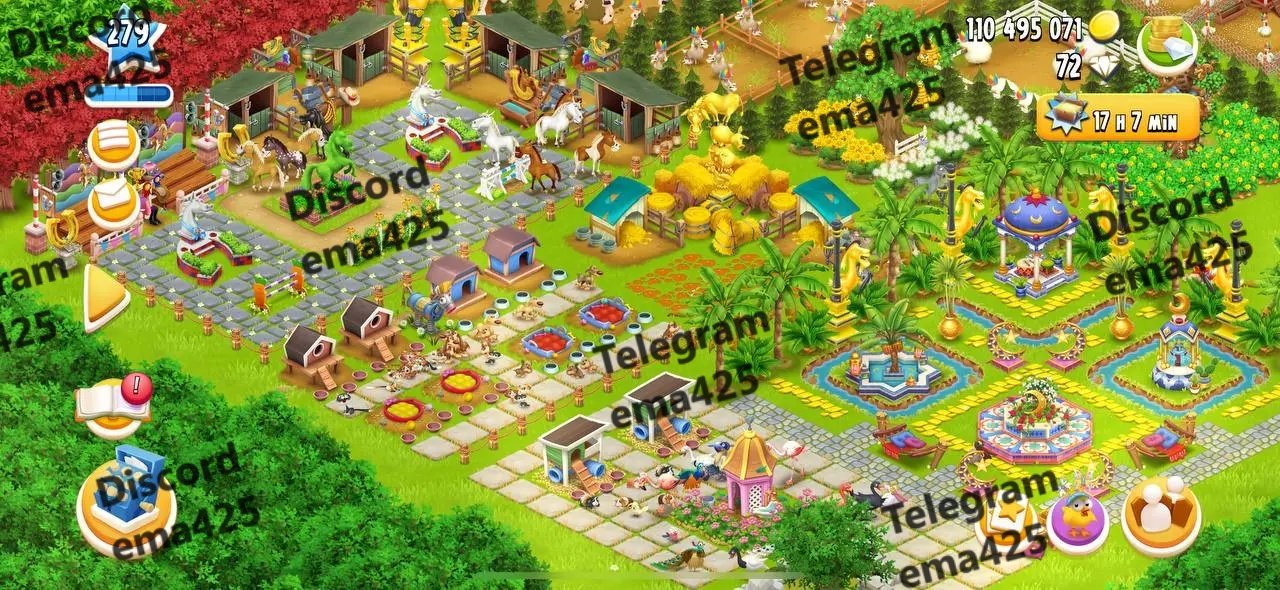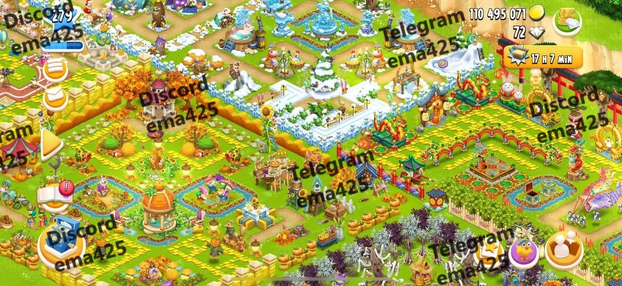 • Decorative details include fountains, statues, arches, hedges, custom paths, and seasonal items throughout.