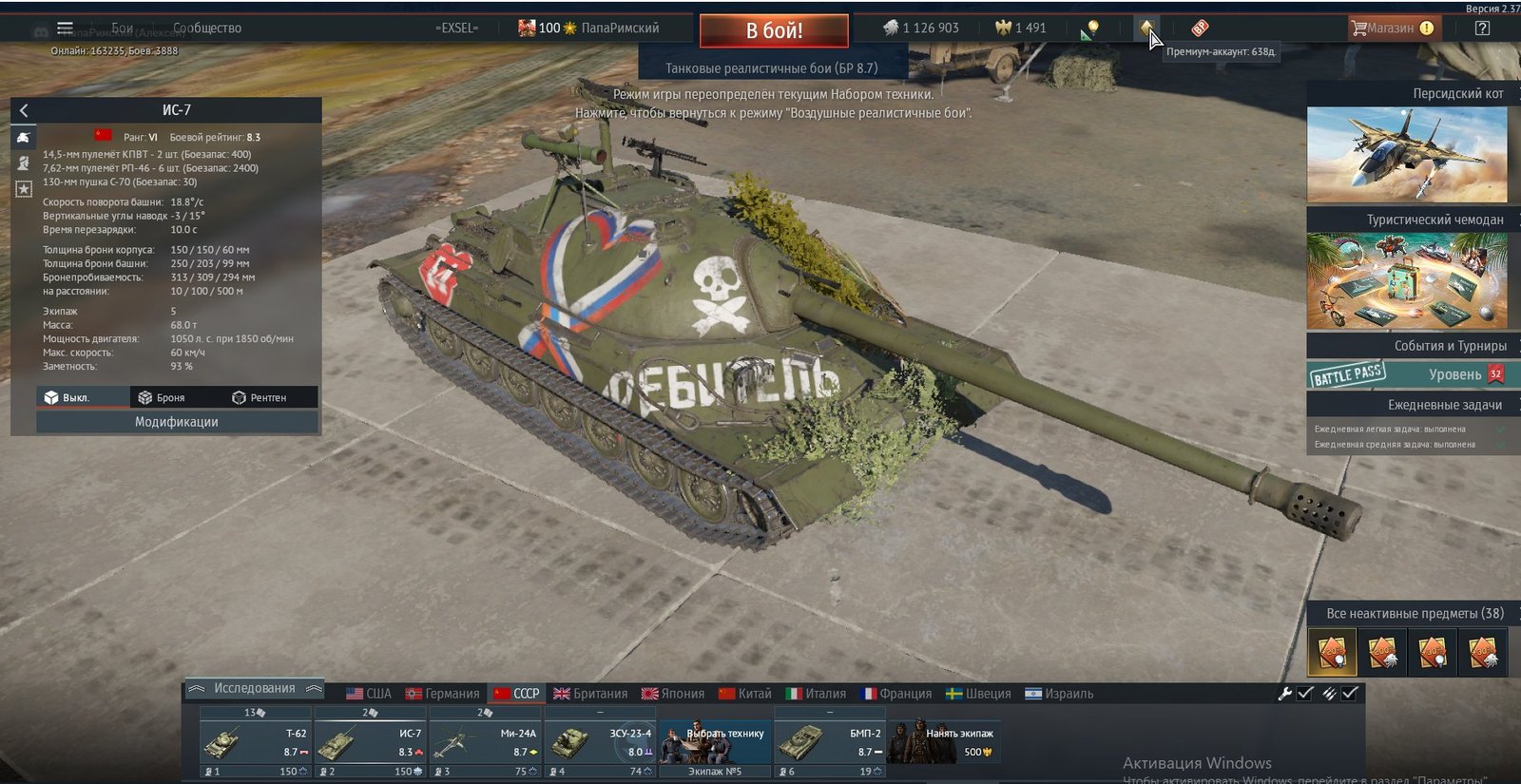 Selling a personal account, registered in 2016, level 100. Rare IS-7 tank! A profitable investment, over time the price of the IS-7 tank will only rise! In stock Approximately 12,000,000 silver, 3491 golden eagles. Rare tanks: IS-7, a normal amount of Premium vehicles! Event vehicles: USSR: IS-7 (8.3), IL-8 (1944). Firepower of the Su-8; Germany: Sd, Kfz.234/4 (4.3), Operation Summer 2016 F7F-3, Operation Heat 2019 AUBL/74 HVG. Premium vehicles: USA: T-14. XM1(GM) Aviation: BTD-1, BF109 F-4, Germany: Sd, Kfz.234/4 (4.3), Aviation P-47D, MIG-23MF; USSR: T-26 (1GvT.Br.), T-34E (4.0), Aviation: Hurricane MKIIB, Pe-2-205, Il-8 (1944), Su-8, Britain : Grant I (2.3), Aviation: Thunderbolt Mk1; Japan: Aviation: P-51C-11-NT: China: M64; Aviation: A6M2 Italy: M13/40(11); Turan II; Aviation: Hs 129 B-2 (Romanian); Bf110G-4 ;France: H.39 “Cambronne” (1.0); Aviation: Yak-3(4.3);Sweden: ShermanIII/IV (3.7).Conventional vehicles, researched before:USA: Army: M1A1 Abrams, ADATS; Helicopters: AH-1Z;Aviation: F8F,;Germany: Army: M48A2 G A2; Tiger (10.5cm Kw.K), Maus, PUMA, Flakpanzer341, Sd,Kfz.234/4 (4.3); Gepard (8.3)Aviation: Fw 190 D; MIG-23MF (10.3);USSR: Army: T-80BVM, Khrizantema-S, 2S6;Helicopters: Mi-24A; Aviation: La-9;Britain: Army: G6; Skink;Japan: Army: M24; M42;Italy: R3 T106 FA; ZSU57-2; BTR-80A; Aviation: IL-10 France: M3A3; VTT DCA;Sweden: U-SH 204 GK, Bkan 1 C;Orders, bets and boosters: Commander’s bet “Golden battles” – 17 pcs., I didn’t count many silver bets of various kinds (“Best squad”, “Destruction of equipment -5”, etc.); a lot of orders of various kinds; The most important thing is a Premium ACCOUNT FOR 650 DAYS.