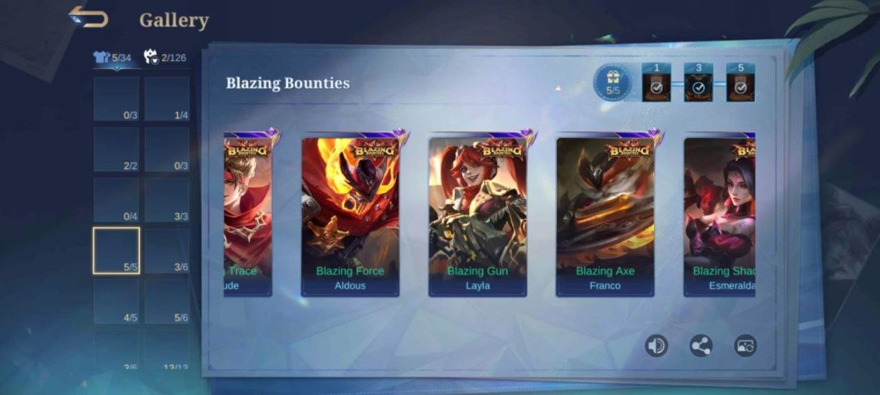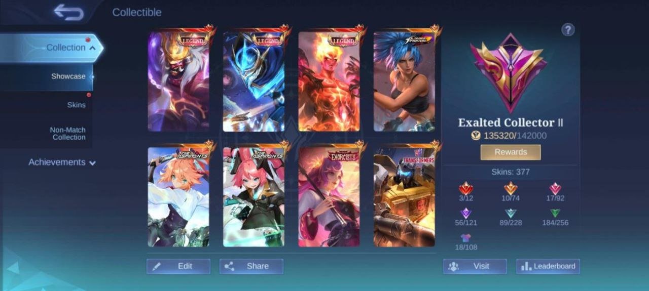Gallery Collab Skin: Jujutsu Kaisan (0/4) – KOF 2nd (0/3) – KOF 1st (2/3) – Zodiac (13/13) – Lightborn (4/5) – Transformers I (2/3) – Transformers II (0/3) – Stun (3/3) – Venom (5/6) – DragonTamer (3/6) – Blazing (5/5) – Forsaken Light (4/4) – 515 eParty (3/3) – Forsaken Light (4/4) – Bronze Saints Series (1/3) – KungFu Panda (1/3) – The Aspirants (1/2) – Atomic Pop Serries (2/2) – Saber (5/6) – MLBB X Scenario (1/3) – Exorcist 2 (1/3) – S.A.B.E.R. Squad (3/6)