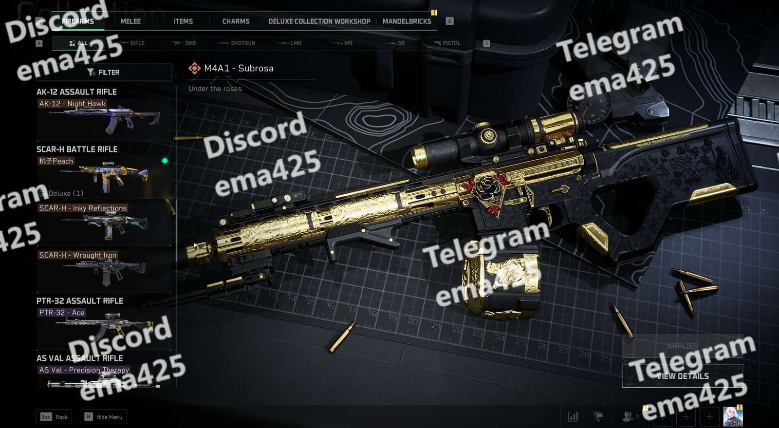 • Highlight: M4A1 Subrosa, SCAR-H Peach, SCAR-H Inky Reflections, M249 Supercomputing, PKM Silent Sentinel, SR-25 Inky Reflections, AS VAL Precision Therapy, MP5 Thalassophobia, P90 Shadow Hunter, Vector High Octane, M1014 Elusive, QBZ95-1 Aurora, QBZ95-1 Ace, K416 Elusive, K416 Competition